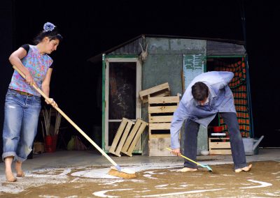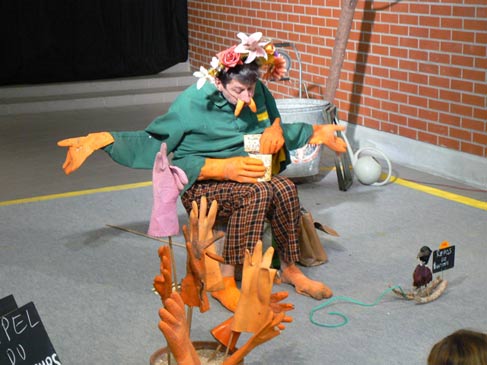 Le spectacle se joue de plain-pied dans un espace de 10 m sur 12m, comprenant l’aire de jeux et un gradinage. Le spectacle est joué dans un dispositif non frontal par quatre comédiens-plasticiens-jardiniers. Ici ou là un sac de terre, une serre, une brouette forment autant de dispositifs scéniques. Le spectacle s’y déroule en actions souvent simultanées : plantations, travaux des champs, cueillettes.